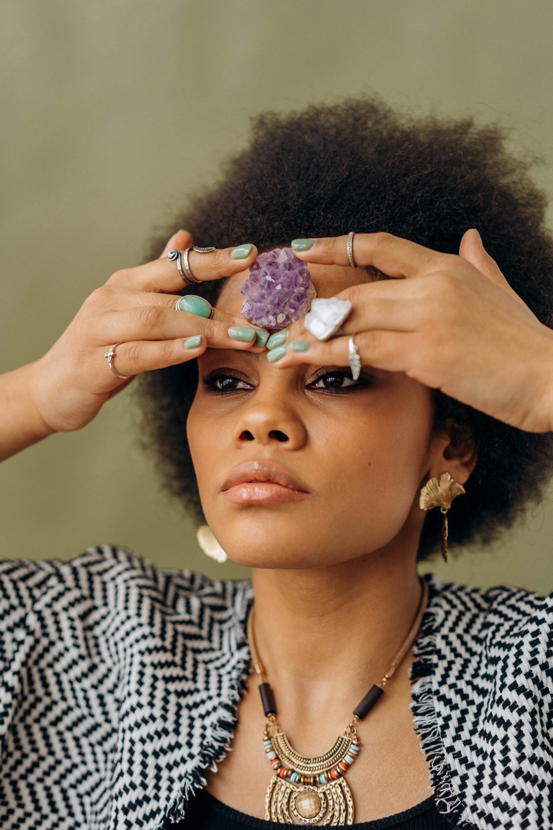 Für das Scheitel-Chakra (Kronenchakra), das für Spiritualität und Erleuchtung steht, verwenden wir den edlen Amethyst. Seine beruhigende Energie fördert inneren Frieden. Das Stirn-Chakra (Drittes Auge), zuständig für Intuition und Weisheit, wird durch den klaren Bergkristall repräsentiert, der Klarheit und geistige Führung unterstützt.